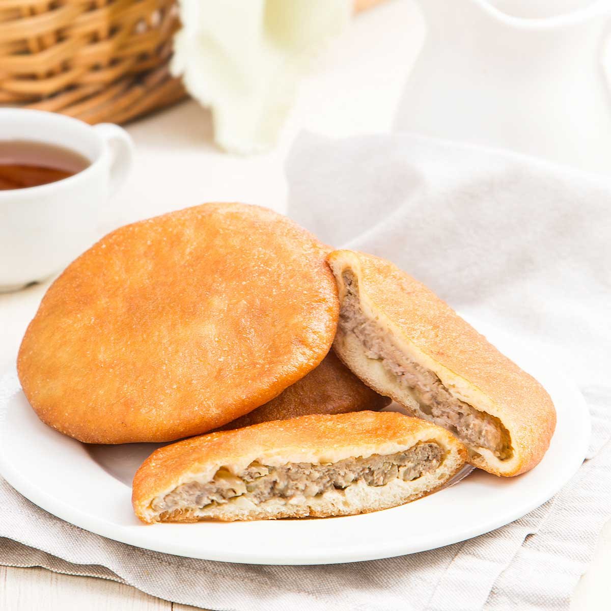 Мука пшеничная в/с, яйцо куриное, масло подсолнечное, сахар-песок, соль пищевая поваренная, дрожжи прессованные, мясо говядины, лук репчатый, перец черный молотый.