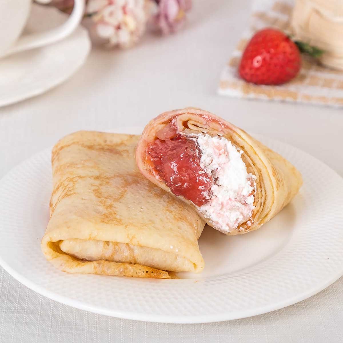 Для блинов: мука пшеничная в/с, яйцо куриное, вода питьевая, сахар-песок, соль поваренная пищевая, масло подсолнечное, вода, молоко. Для начинки: творог, сахар-песок, сливки растительные, ванилин.