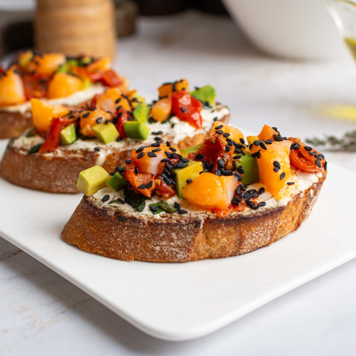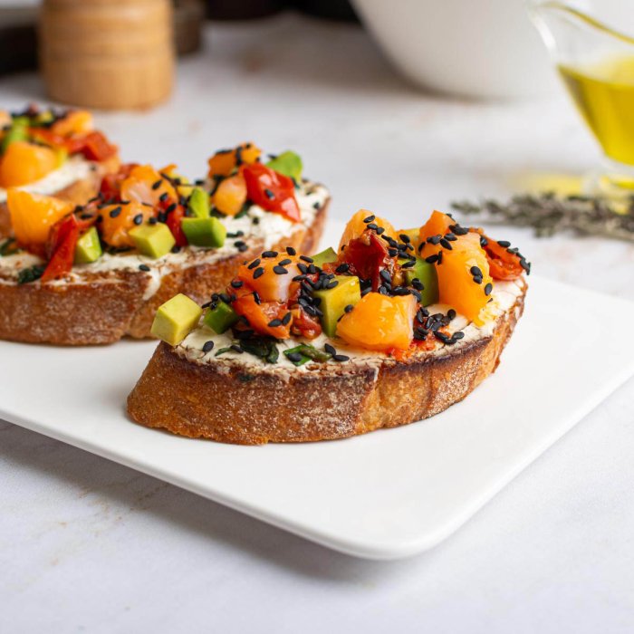 Французский багет, поджаренный до золотистой хрустящей корочки, с нежным творожным сыром, ореховой ноткой авокадо, сладостью черри конфи и морской свежестью креветок. Легкая, красивая и сбалансированная закуска, в который каждый оттенок богатой палитры стоит точно на своем месте, для того чтобы подарить вам истинный вкус итальянской брускетты.