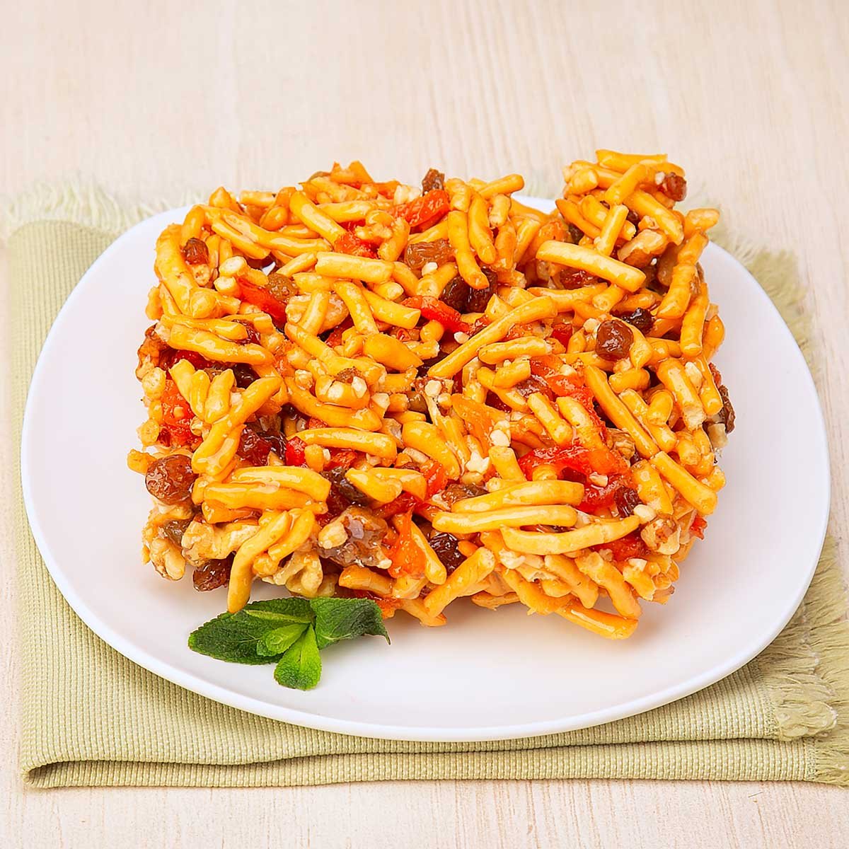 Мед, яйцо куриное, мука пшеничная в/с, сахар, курага, изюм, орех грецкий, арахис, масло подсолнечное, соль.