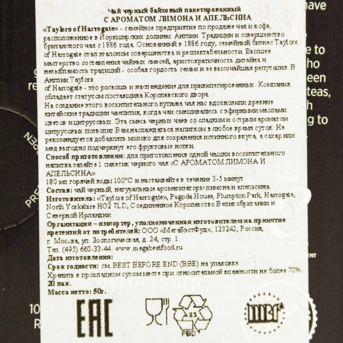 Чай ТэйлорОфХаррогейт с ароматом лимона и апельсина к/к 20*50г