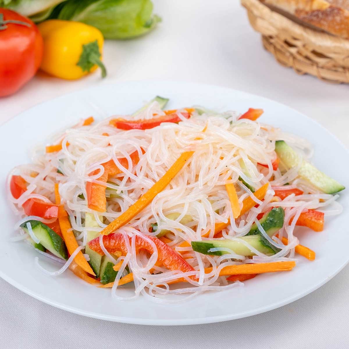 Фунчоза в сочетании со свежими огурцами, болгарским перцем, морковью и заправкой для фунчозы. Салат заправлен растительным маслом.