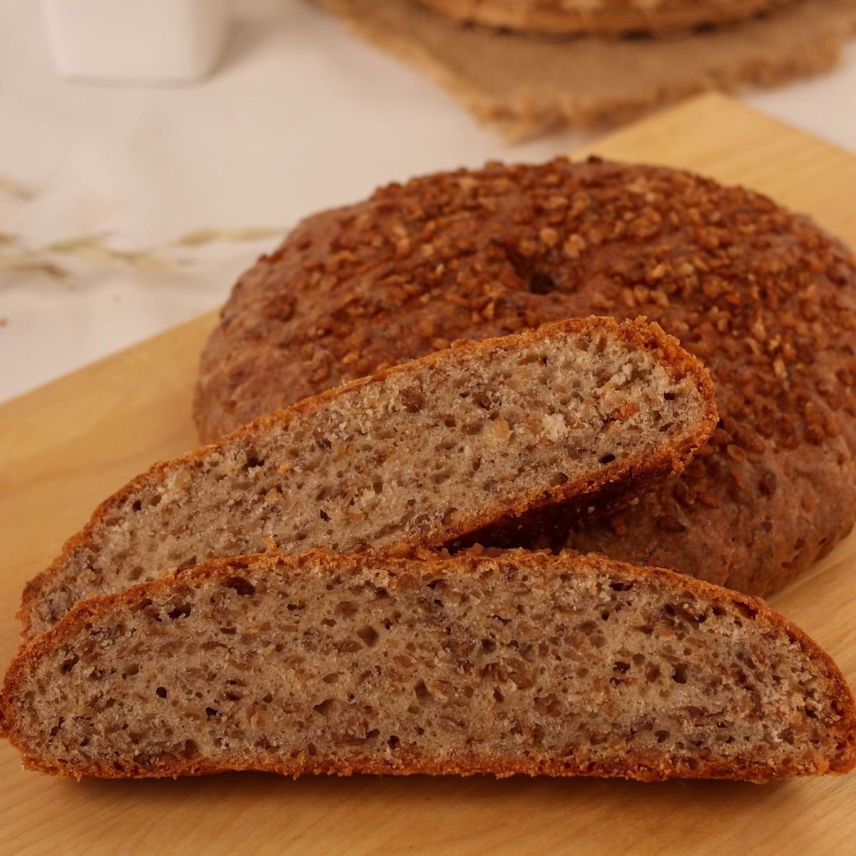 Хлеб по оригинальной рецептуре, который мы готовим из пшеничной муки, гречневых хлопьев и кефира. Отличается насыщенным пикантный вкусом и очень полезен, благодаря своему богатому составу витаминов и микроэлементов. Идеален для диетического питания!
