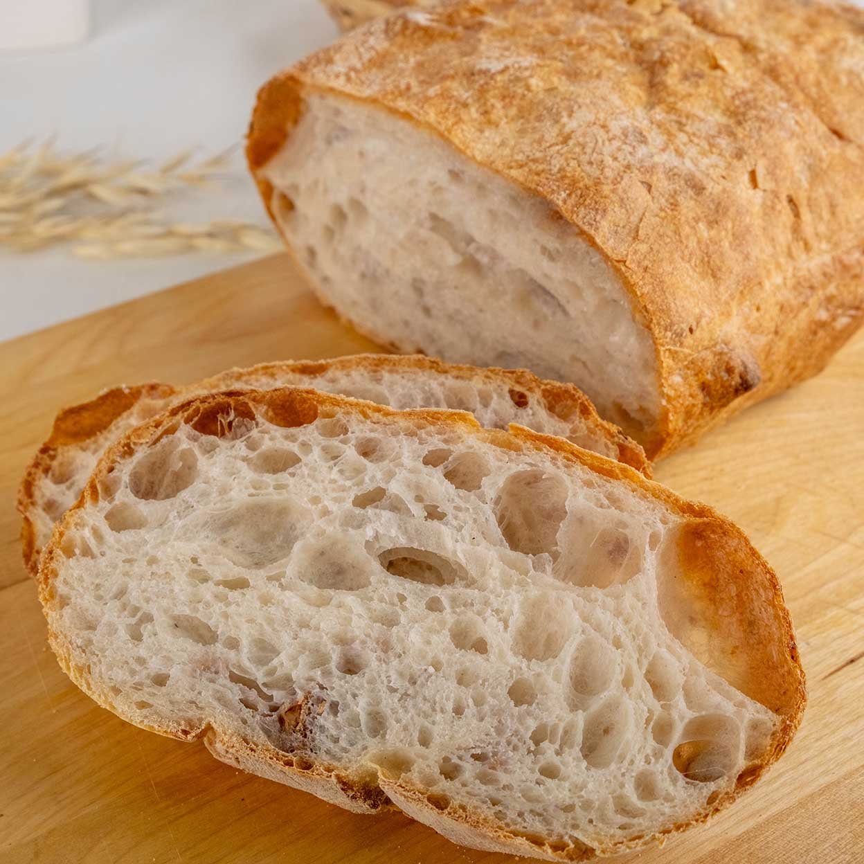 Ароматный хлеб на закваске из пшеничной и ржаной муки с добавлением солода. Отличается глубоким вкусом с пикантной кислинкой, хрустящей корочкой и плотным, пористым мякишем. Благодаря длительной ферментации он имеет насыщенный аромат и прекрасно подходит к первым и вторым блюдам.
