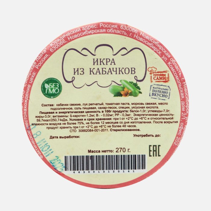 Кабачки свежие, лук репчатый, томатная паста, майонез, масло подсолнечное, соль поваренная пищевая, сахар-песок, специи, уксусная кислота. Витамины: В₁ - 0,02мг; РР - 0,3мг