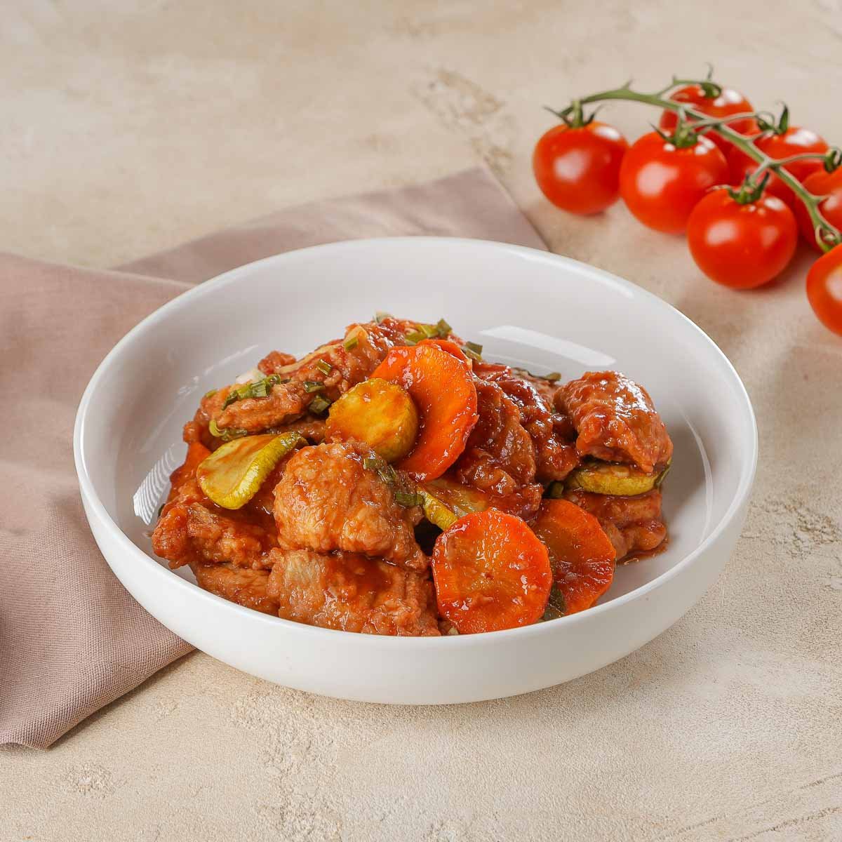 Кусочки индейки, томленые с морковью и молодым кабачком в пикантном томатном соусе с пряными нотками имбиря. Отлично сочетается с горячим рисом. Угощайтесь!