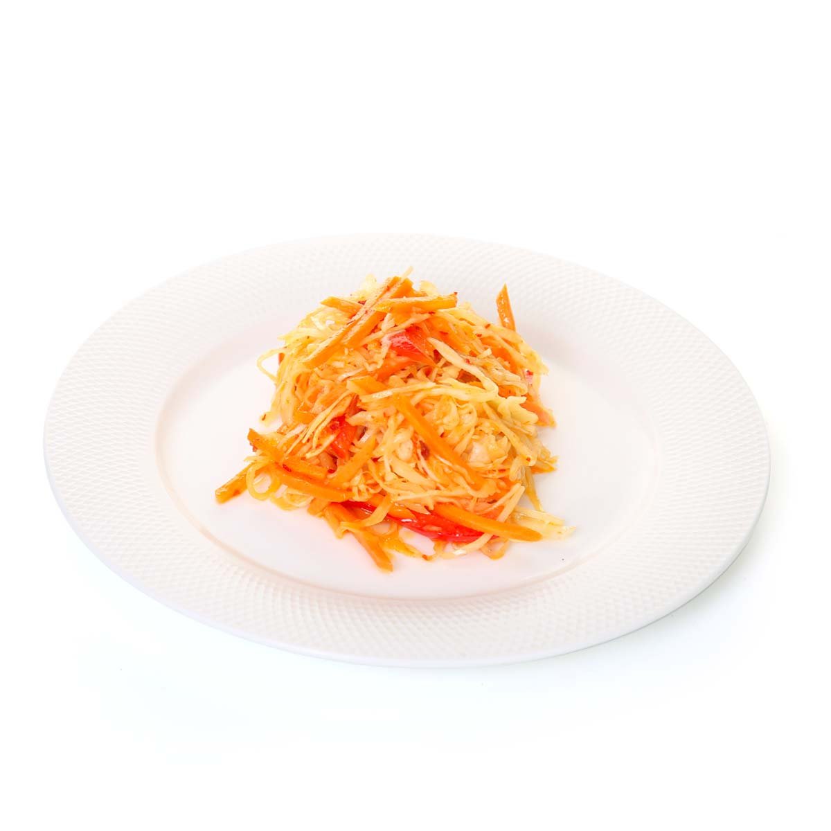 Капуста белокочанная свежая, морковь свежая, перец болгарский свежий, сахар-песок, заправка салатная кимчи, масло подсолнечное, соль пищевая, перец красный молотый.