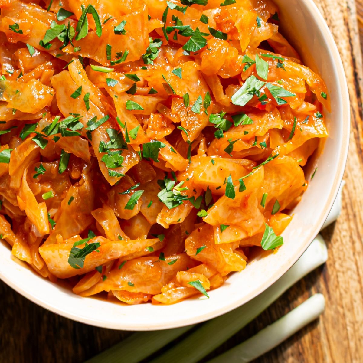 Капуста белокочанная, морковь, лук репчатый, масло подсолнечное, томатная паста, сахар, соль, мука пшеничная в/с, зелень, уксус, перец черный молотый, перец черный горошек, лавровый лист.