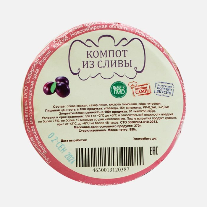 Слива свежая, сахар-песок, кислота лимонная, вода питьевая. Витамины: РР-0,3мг; С-2,0мг
