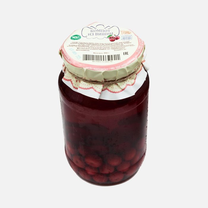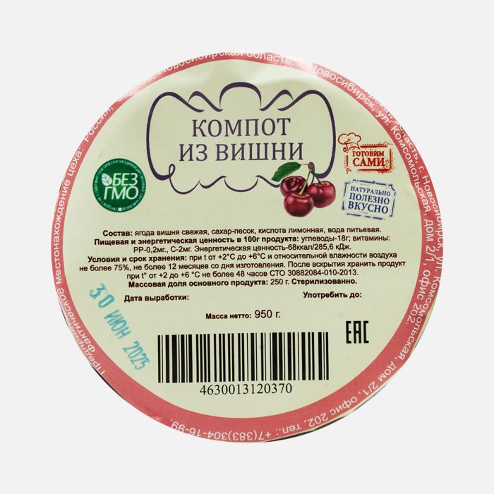 Вишня свежая, сахар песок, вода питьевая. Витамины: РР-0,2мг; С-2мг