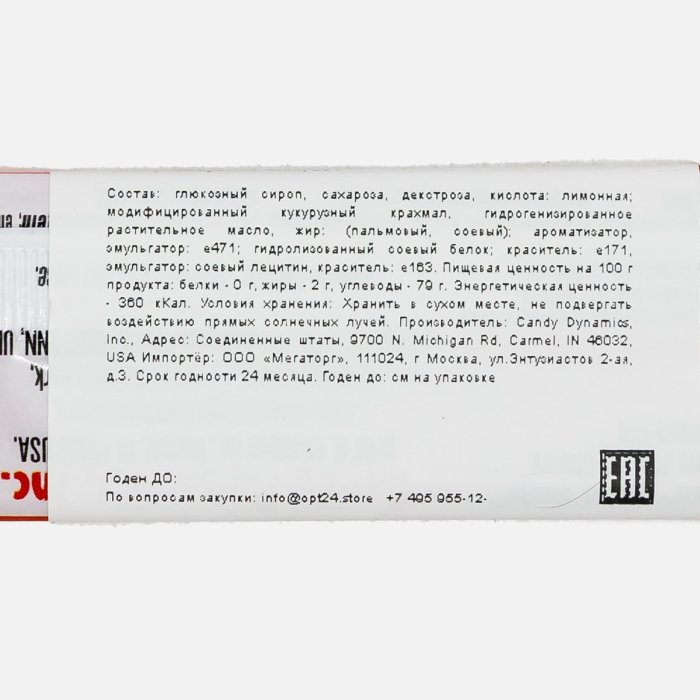 глюкозный сироп, сахароза, декстроза, кислота: лимонная; модифицированный кукурузный крахмал, гидрогенизированное растительное масло, жир: (пальмовый, соевый); ароматизатор, эмульгатор: e471; гидролизованный соевый белок; краситель: e171, эмульгатор: соевый лецитин, краситель: e163.