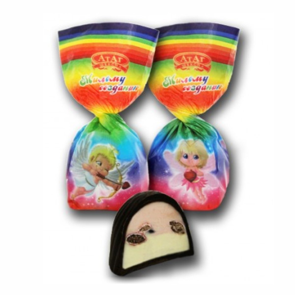 Кондитерская глазурь: (сахарный песок, какао-порошок, ароматизатор-ванилин, заменитель какао масла), начинка пралине (сахарный песок, заменитель какао масла, сухое молоко цельное, сыворотка сухая), сухая чечевица, ароматизатор: клубника-банан, малина-сливки.