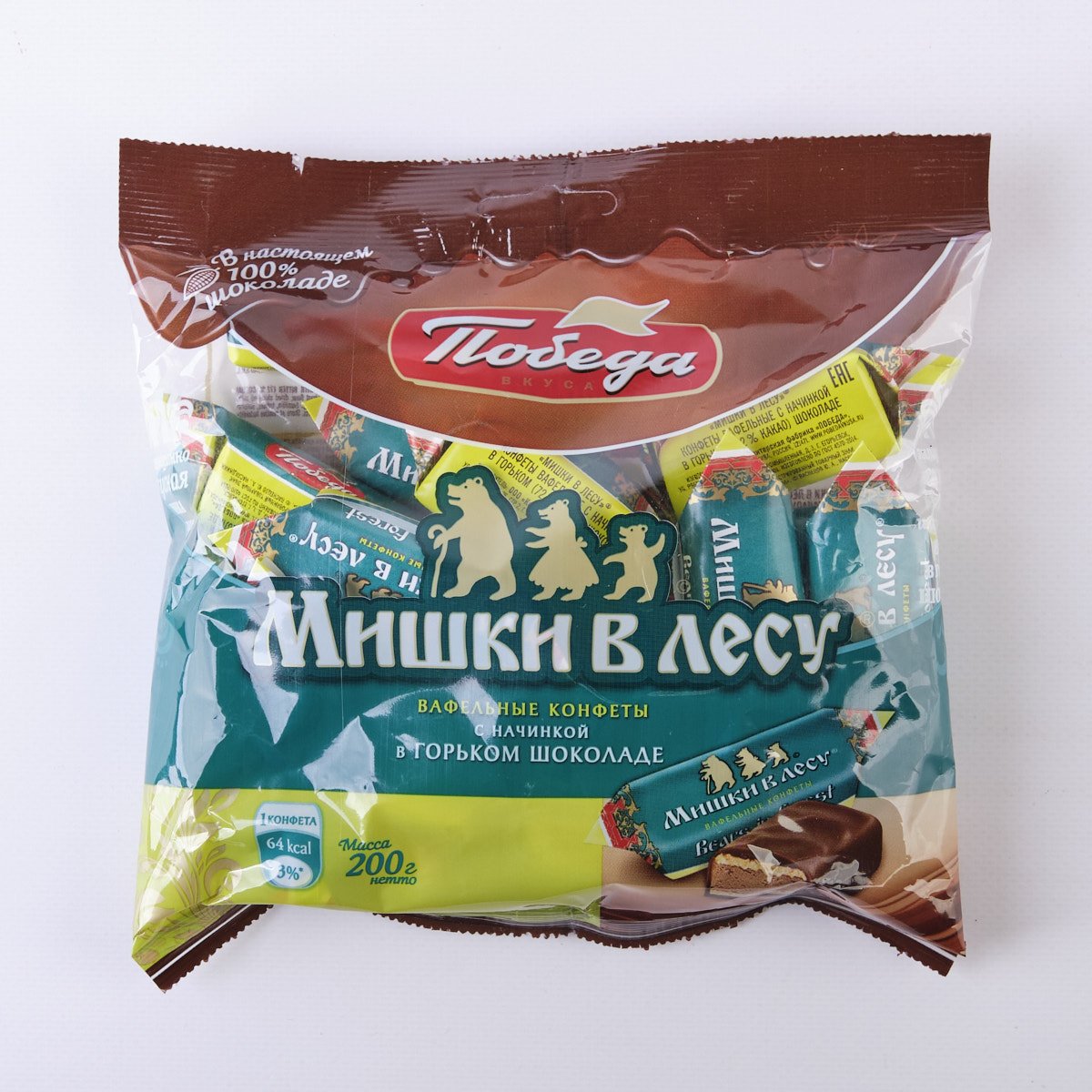 Конфеты Победа вкуса Мишки в лесу вафельные в горьком шоколаде 200г