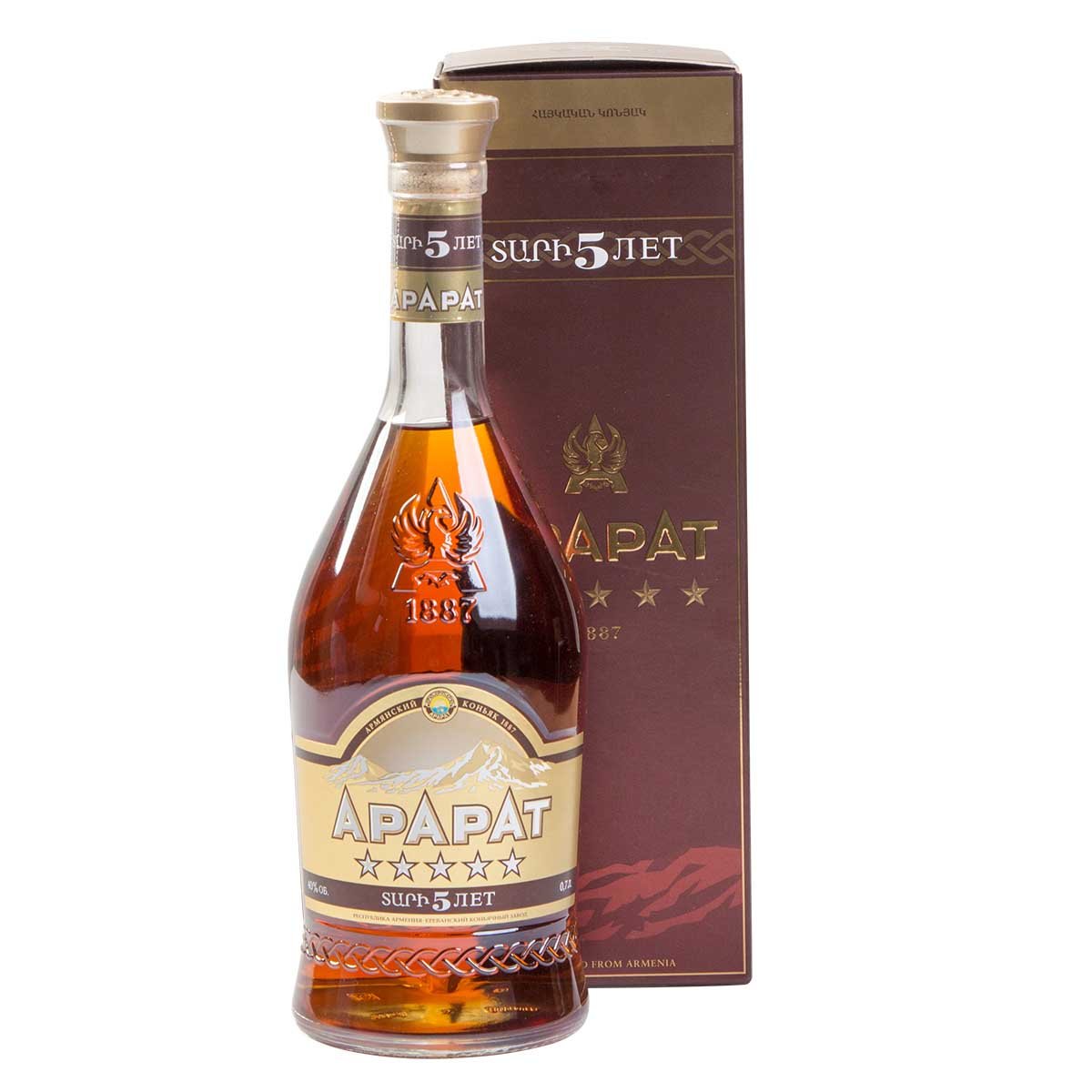 Согласно библейским преданиями именно Араратская земля является колыбелью человечества, и именно здесь берет начало виноградарство и виноделие. Посетив Армению, английский государственный деятель Джеймс Брайс сказал: «Если и в самом деле человек впервые ступил здесь на землю, более впечатляющего центра вселенной и представить нельзя». Пятилетний ординарный коньяк АРАРАТ «Пять звезд» — пожалуй, самый популярный в гамме. У него характерный аромат спелой и сочной сливы, ноты сладкого армянского персика и тонкий, деликатный вкус с оттенком черной смородины. Яркий и щедрый коньяк АРАРАТ «Пять звезд» наполнит ваши праздничные застолья и дружеские встречи энергией и радостью жизни. Выдержка 5 лет. Крепость — 4%.