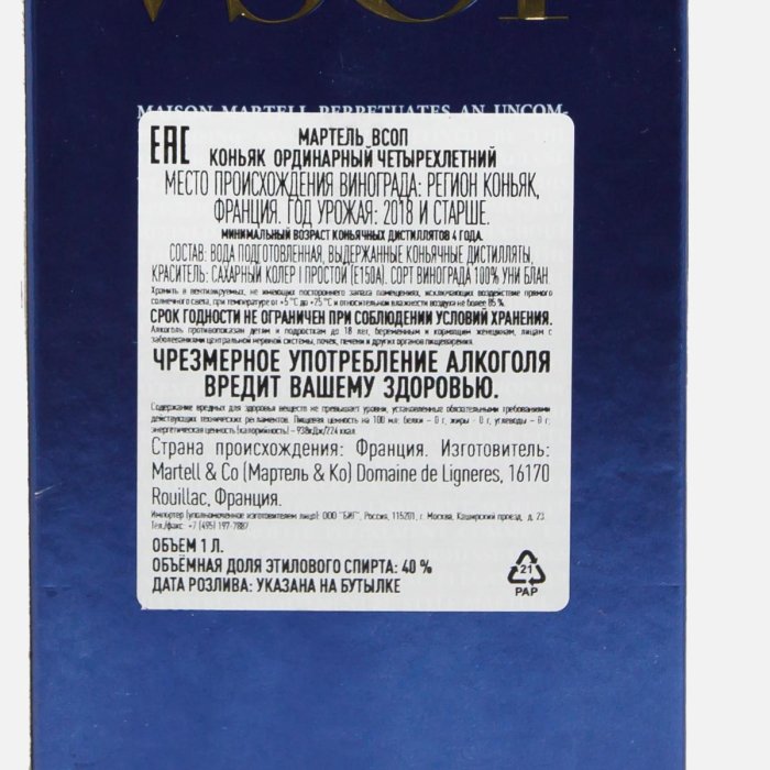 Коньяк Мартель ВСОП четырехлетний 40% п/у 1л