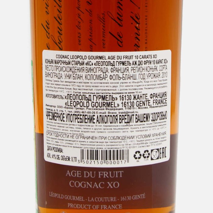 КоньякЛеопольдГурмельАж дюФруи10 карат ХО мароч стар КС 41% п/у 0,7л