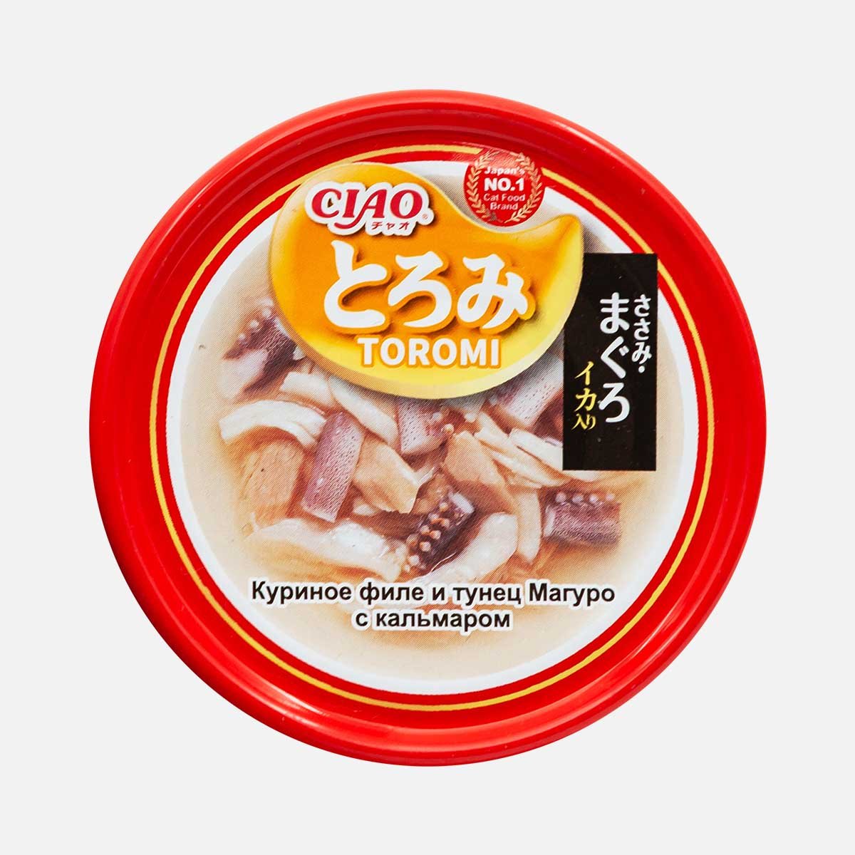 Корм Инаба д/кошек Чао Тороми Кур филе/тунец /кальмар ж/б 80г