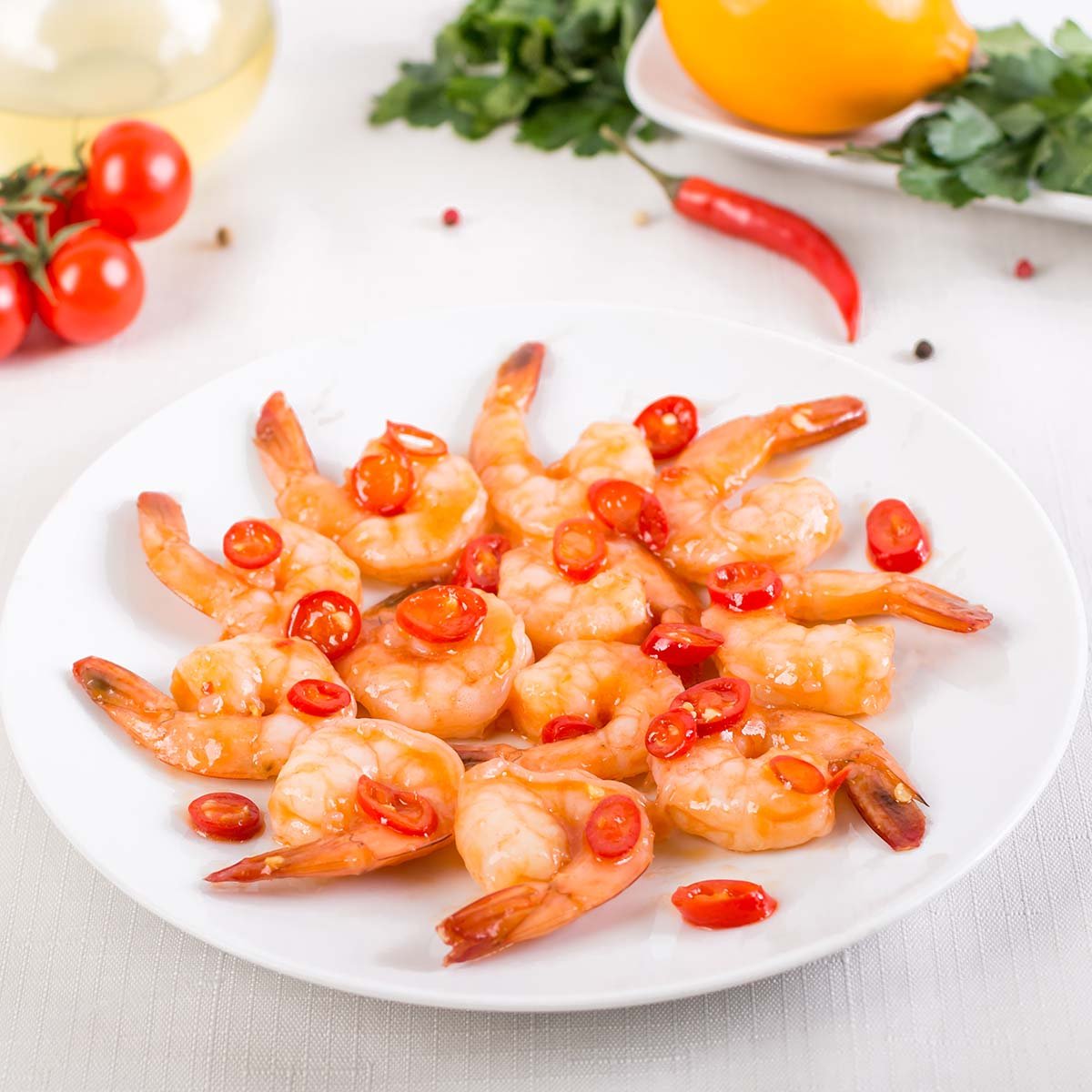 Креветка очищ с хвостом, соус сладкий чили, кетчуп, масло подсолнечное, лимон, соль, перец жгучий красный стручок и молотый.
