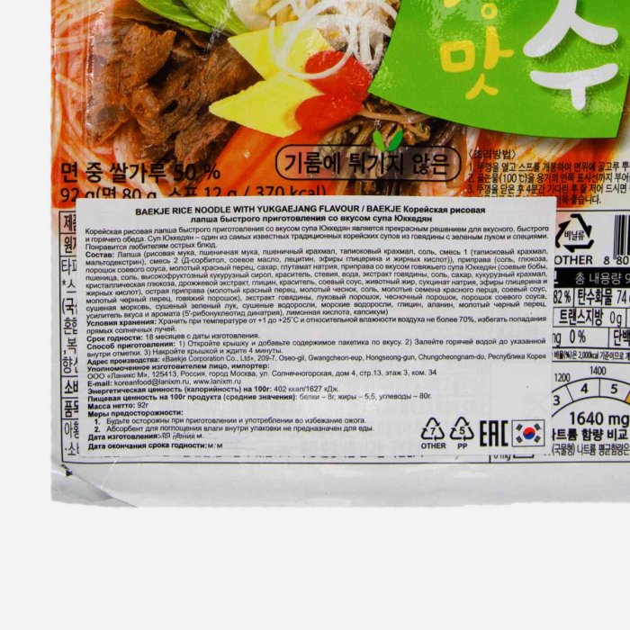 Лапша Баекже Рисовая со вкусом супа Юккедян б/п 92г