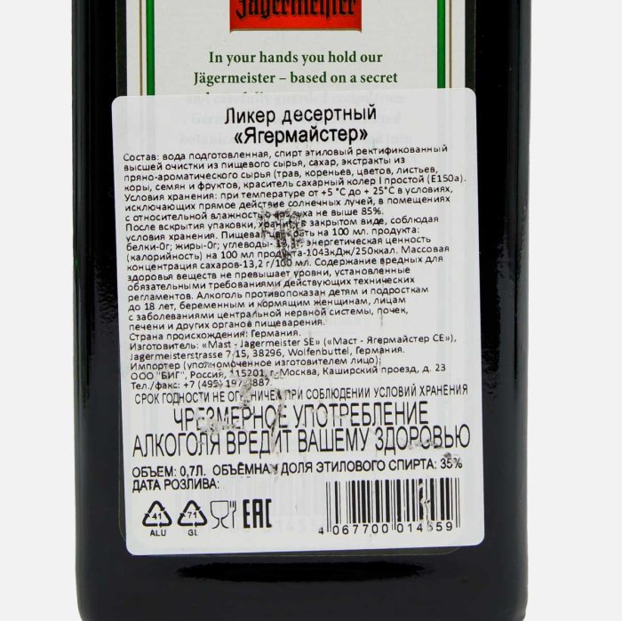 Ликер Ягермайстер десертный 35% ст/б/шф 0,7л
