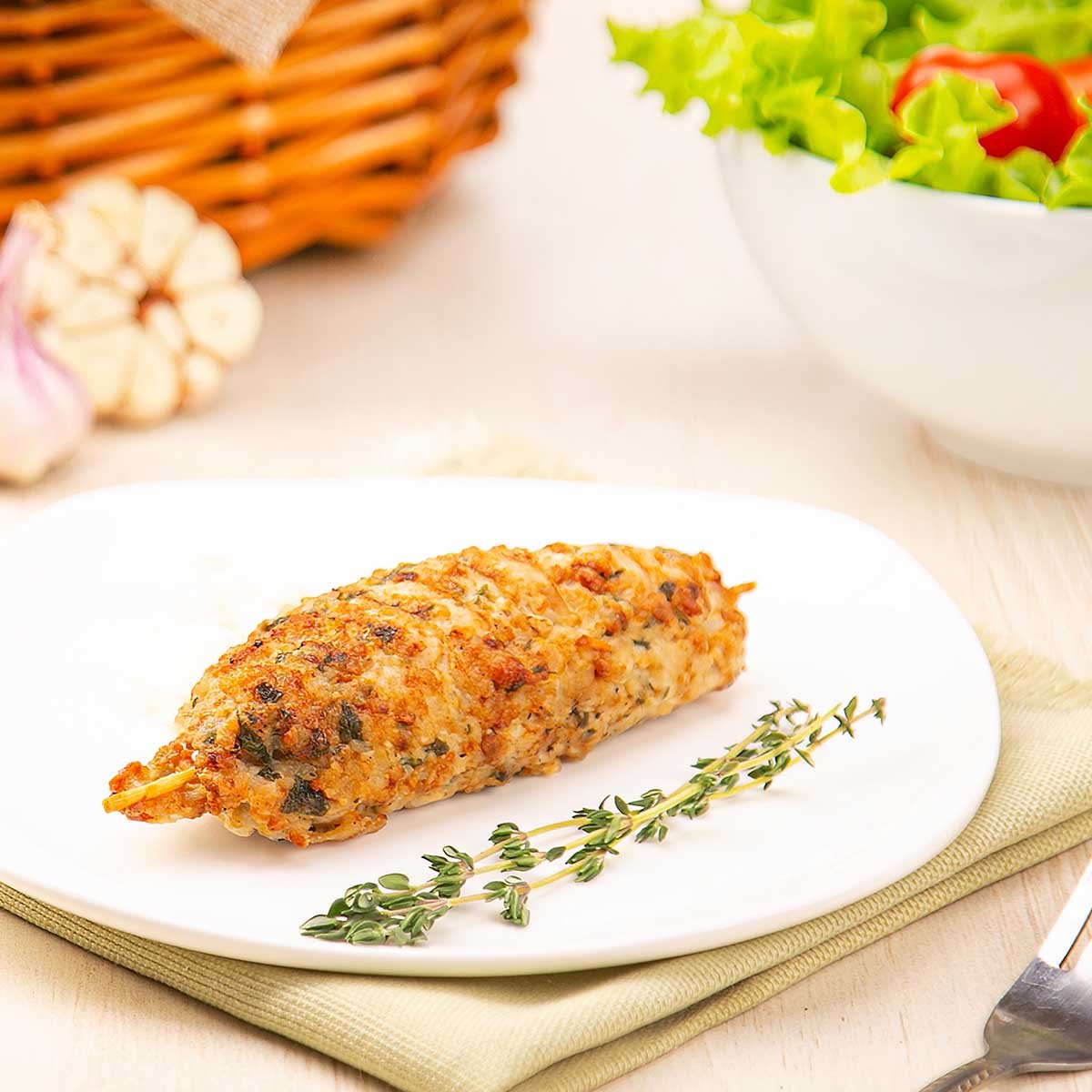 Мясо цыпленка, лук репчатый свежий, чеснок свежий, масло сливочное, зелень свежая, смесь 4 перца, соль пищевая