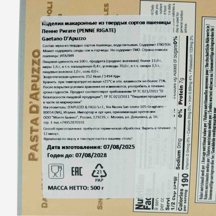 Мука из твердых сортов пшеницы, вода питьевая. Содержит глютен. Может содержать следы сои и горчицы. Не содержит ГМО.