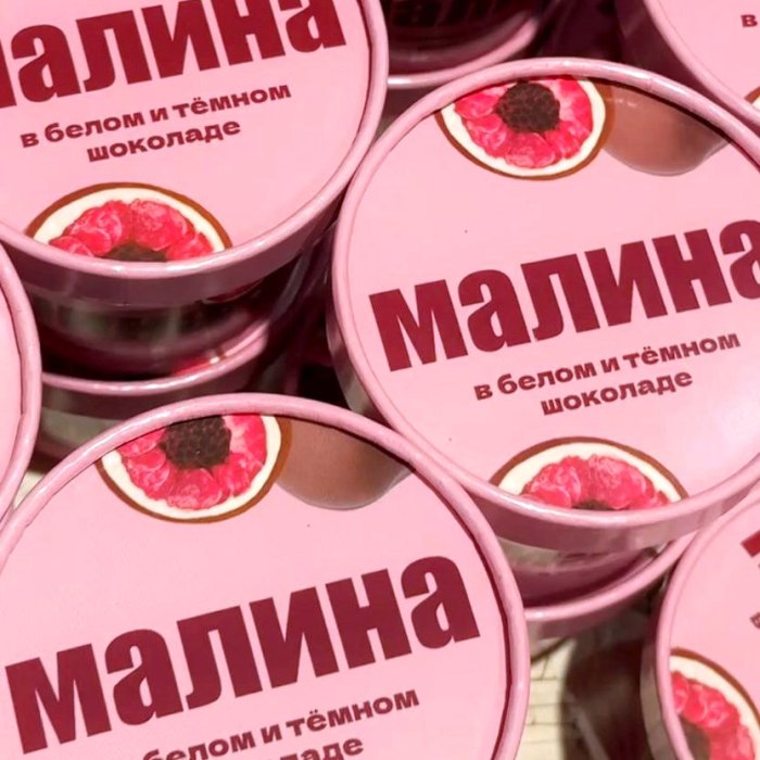 Малина быстрозамороженная, шоколад белый, шоколад молочный, масло подсолнечное. После вскрытия хранить в холодильнике. Повторное замораживание не допускается