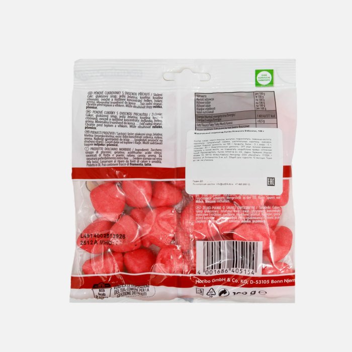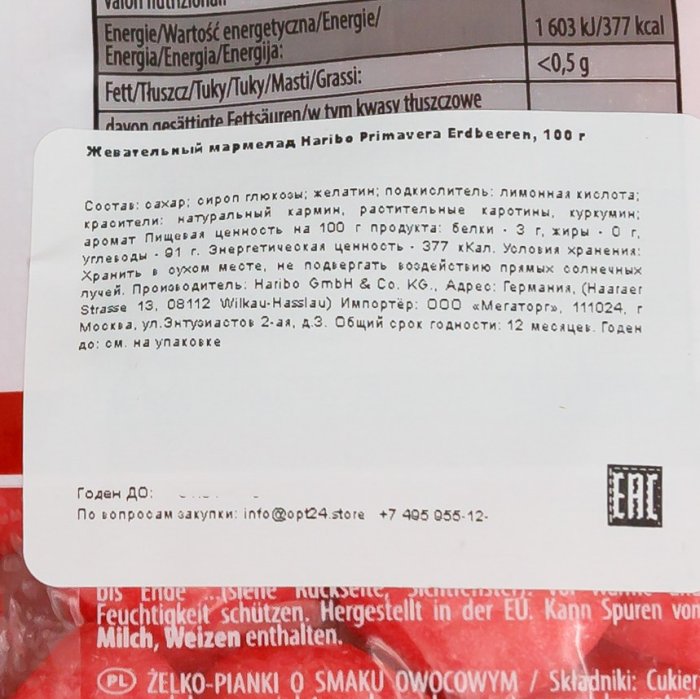 сахар; сироп глюкозы; желатин; подкислитель: лимонная кислота; красители: натуральный кармин, растительные каротины, куркумин; аромат.