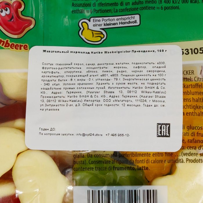 глюкозный сироп, сахар, декстроза, желатин, подкислитель: e330, фруктово-растительные концентраты: морковь, сафлор, сладкий картофель, спирулина, яблоко, лимон, редис, черная смородина, ароматизатор, покрывающий агент: e901, e903.