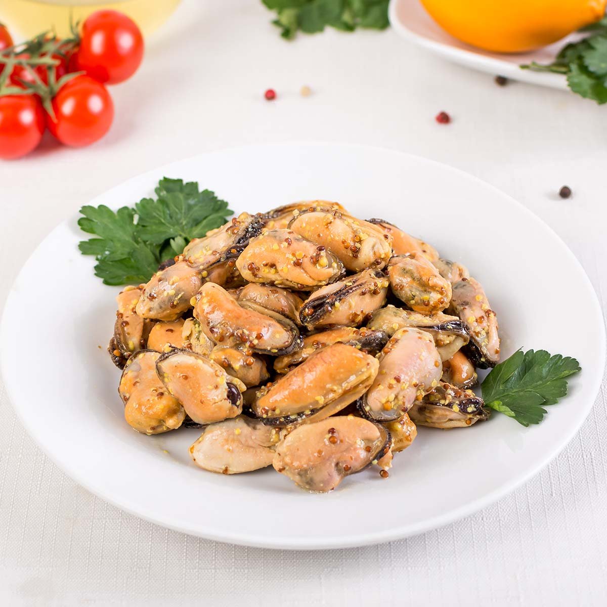 Мидии в/м, соль, сахар, масло подсолнечное, горчица французская, уксус.