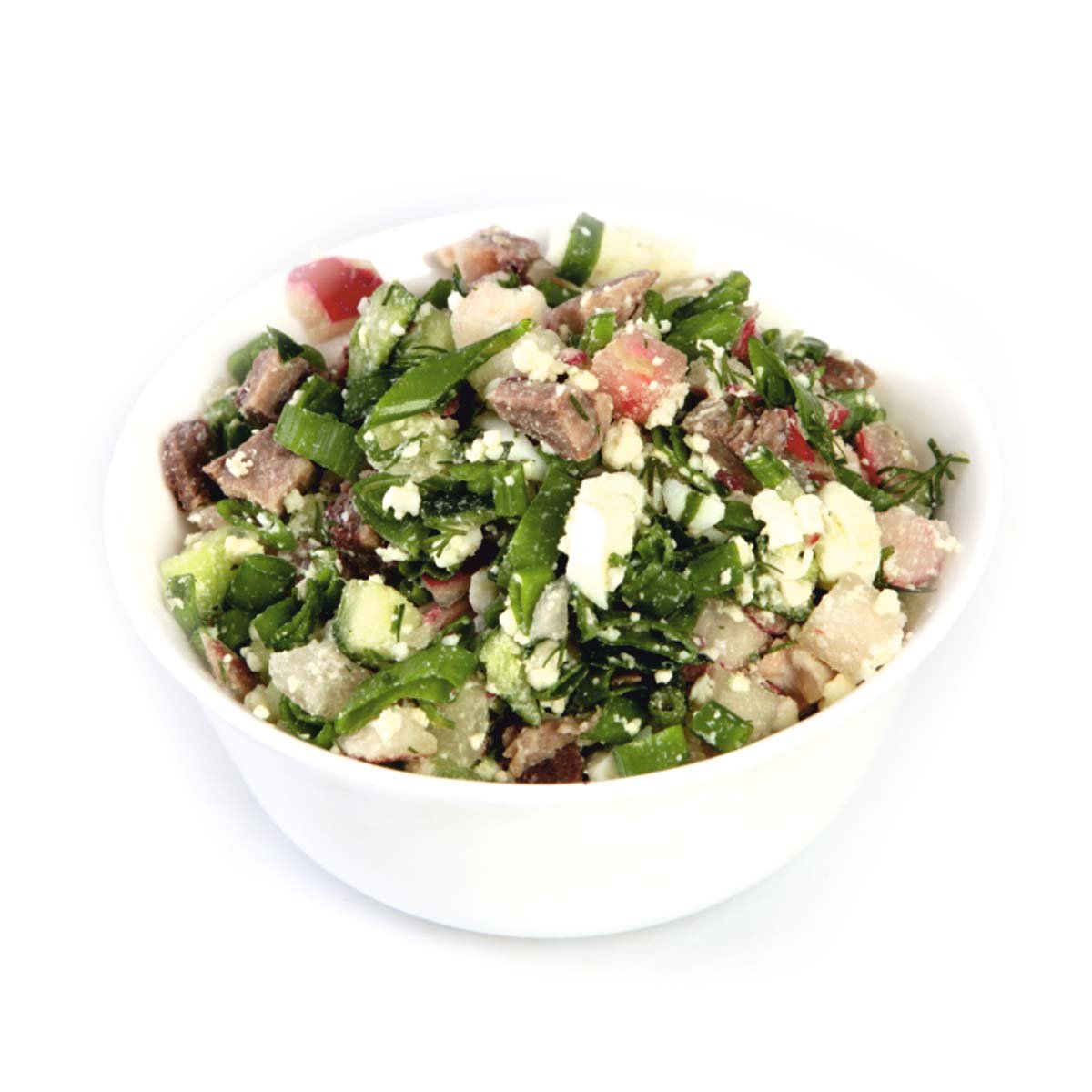 Язык говяжий, огурцы свежие, редис свежий, яйцо куриное, лук зеленый, укроп, соль пищевая.