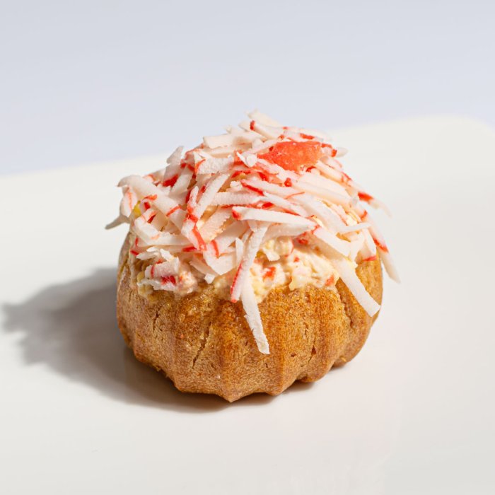 Воздушные, заварные пирожные, начиненные сливочным крабовым салатом. Классическое сочетание сладкого теста и соленой начинки дарит сбалансированный и насыщенный вкус. Поверьте, от наших профитролей невозможно оторваться, и они моментально исчезают с праздничного стола!
