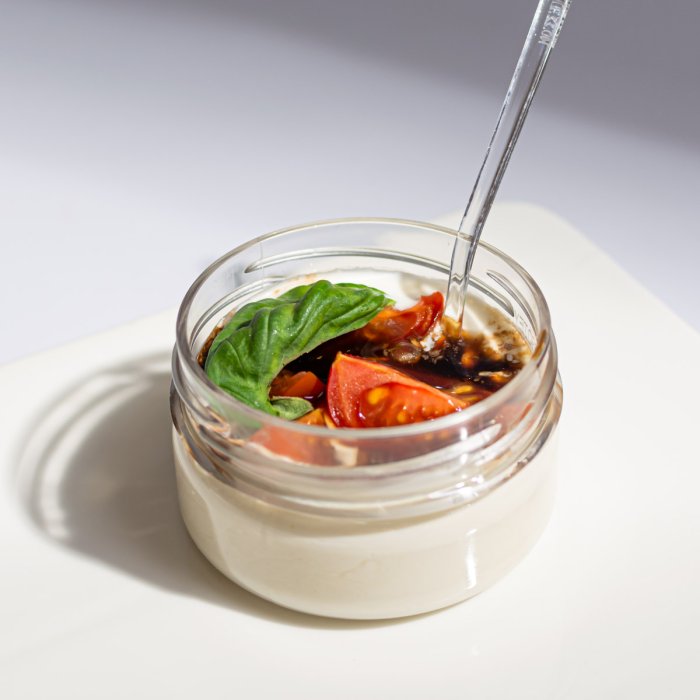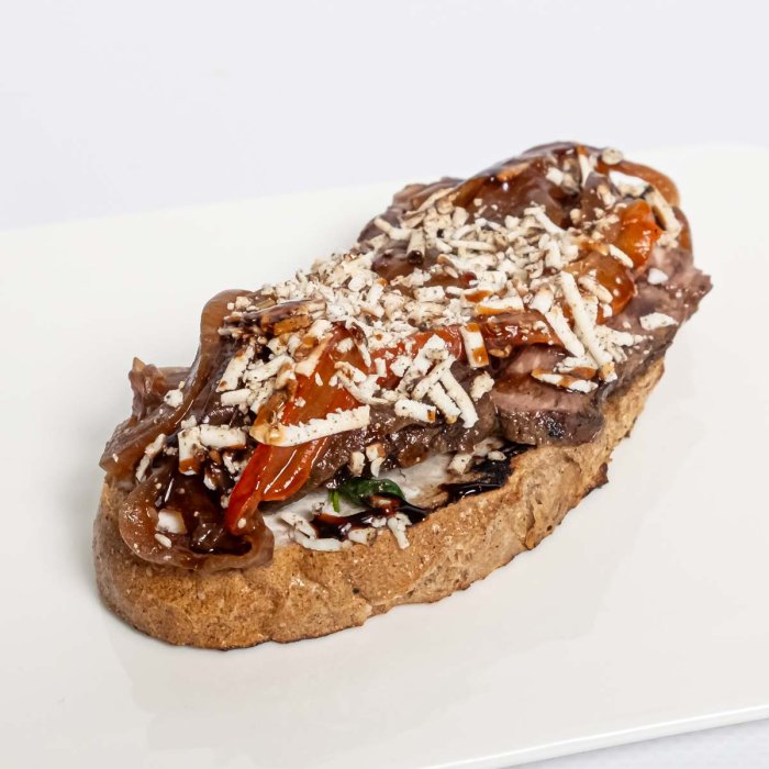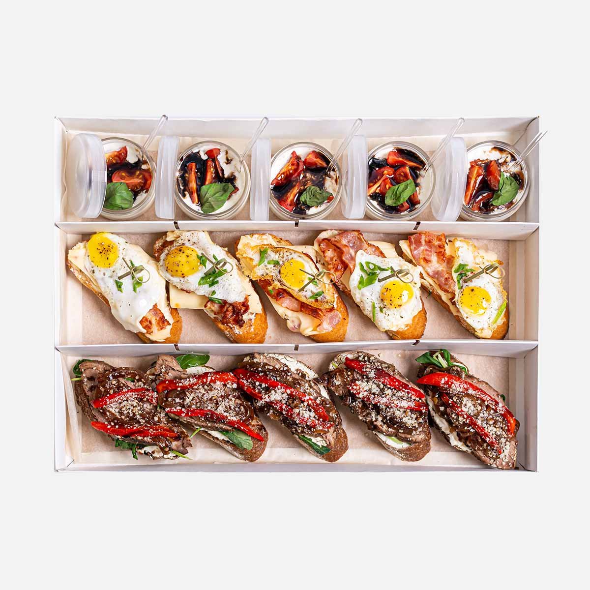 Закуска фуршетная cливочный Страчателла/томаты черри/соус Бальзамик: крем cливочный Страчателла 60%,томаты черри,соус Бальзамик(уксус бальзамич, сахар-песок) зелень базилика. Пищевая ценность в 100г продукта: белки 10,5г, жиры 24,5г, углеводы 5,3г. Бутерброд для завтрака: Багет пшеничный,сыр бутербродный плавленый с ветчиной,бекон в/к,яйцо перепелиное,масло сливочное,чеснок,лук зеленый,перец ч/м. Пищевая ценность в 100г продукта: белки 6г, жиры 17,6г, углеводы 13,2г. Брускетта с ростбифом: багет ржаной,мясо говядины,перец болгарский,сыр творож,лук репч,соевый соус,крем бальзамик,руккола свежая,сыр Белпер Кнолле. Пищевая ценность в 100г продукта: белки 7г, жиры 18,6г, углеводы 25,1г. Продукция производится на предприятии, где используется арахис, кунжут, соя, рыба, ракообразные, молоко (лактоза), орехи, сельдерей. Закуска фуршетная cливочный Страчателла/томаты черри/соус Бальзамик 283,7ккал/1191,5кдж, Бутерброд для завтрака 235,2ккал/987,84кдж, Брускетта с ростбифом 295,8ккал/1242,3кдж