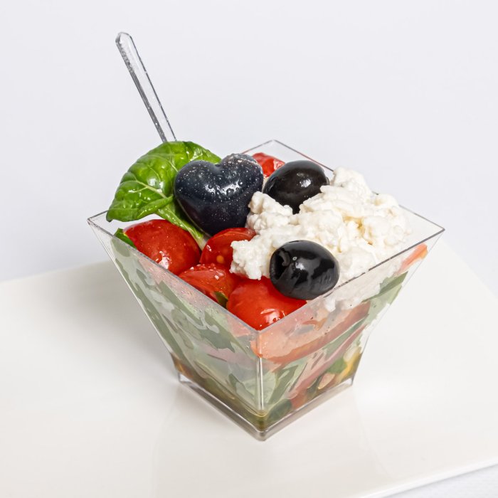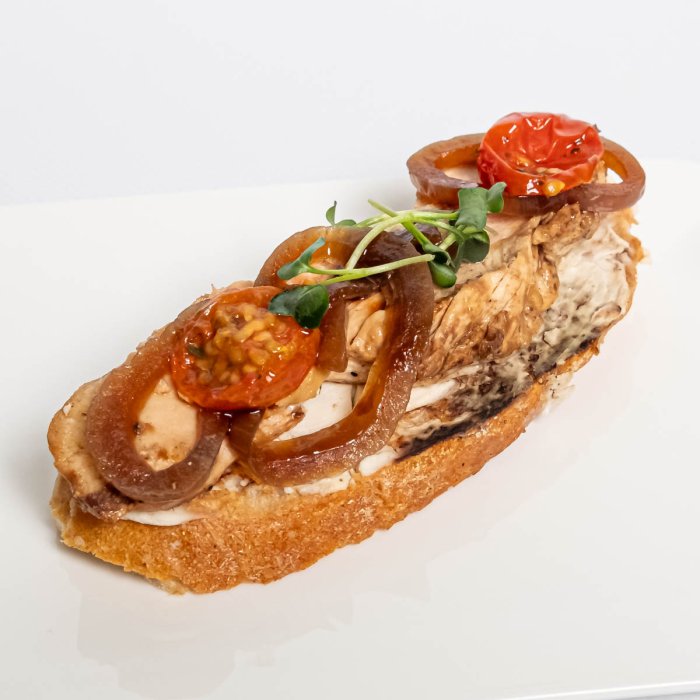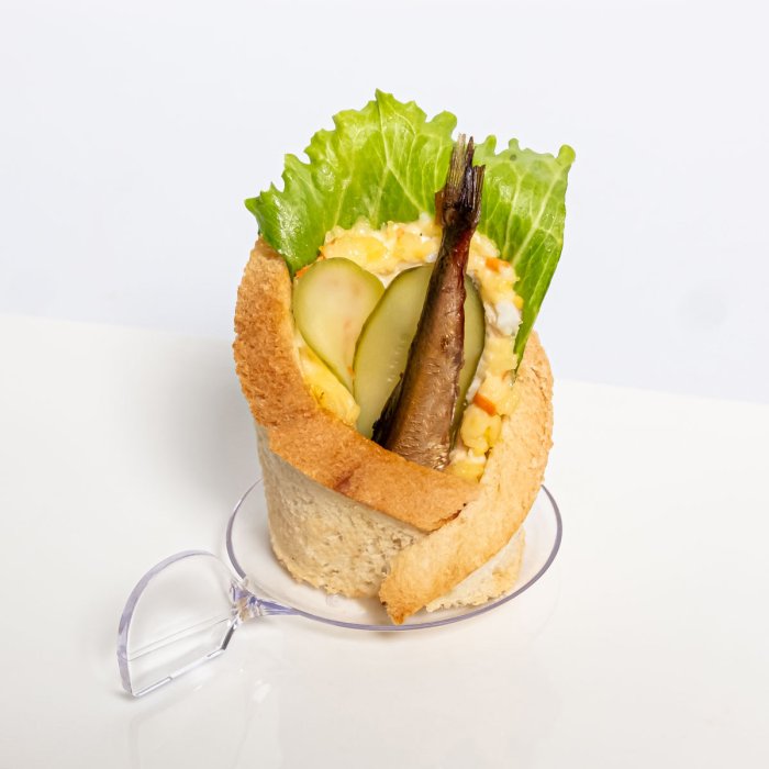 Закуска Рыбки в пруду (хлеб для сэндвичей, сыр твердый, яйцо куриное, морковь, чеснок, майонез, шпроты, огурцы маринованные, лист салата). В 100г продукта содержится: Белки-11,5г,Жиры-20,2г,Углеводы-20,3г; Салат Зеленый с овощами и сыром рикотта (сыр рикотта, помидоры черри, черри Конфи, салат пак-чой, перец болгарский свежий, маслины; для соуса (масло подсолнечное, соус бальзамический, соль пищевая)). В 100г продукта содержится: Белки-3,3г,Жиры-9,7г,Углеводы-4,6г; Брускетта с филе куриным (багет Французский (мука пшеничная в/с, патока крахмальная, соль, дрожжи, масло подсолнечное, закваска пшеничная), филе куриное, лук репчатый свежий, масло подсолнечное, соус соевый, сыр рикотта, кориандр, томаты черри конфи, микрозелень горчицы, крем бальзамик). В 100г продукта содержится: Белки-16,42г,Жиры-7,52г,Углеводы-2,85г