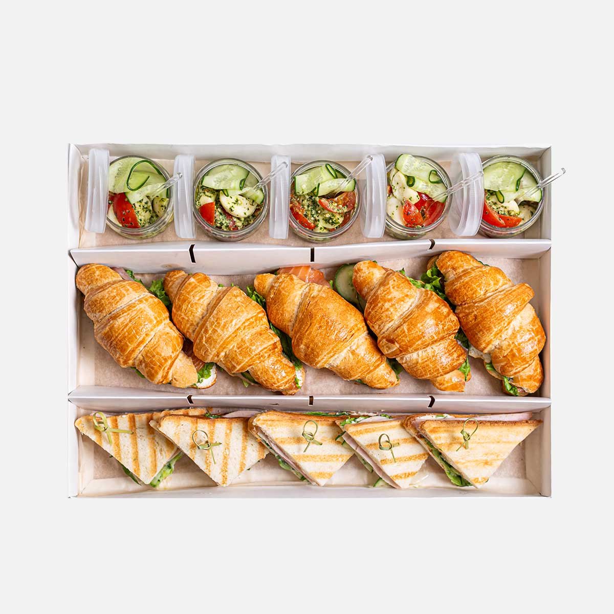 Закуска фуршетная томаты черри/сыр моцарелла/огурец свежий/соус песто: cыр моцарелла, томаты черри, огурец свежий, соус песто. Пищевая ценность в 100г продукта: белки 10,8г, жиры 18,2г, углеводы 5,6г. Сэндвич с красной рыбкой: круассан, семга слабосоленая, огурцы свежие, сыр рикотта, салат листовой, соус песто. Пищевая ценность в 100г продукта: белки 9,4г, жиры 12г, углеводы 17,4г. Сэндвич с ветчиной и огурцом: хлеб для сэндвичей, ветчина, сыр плавленый, свежий огурец, лист салата Айсберг. Пищевая ценность в 100г продукта: белки 7,5г, жиры 11г, углеводы 23,6г. Продукция производится на предприятии, где используется арахис, кунжут, соя, рыба, ракообразные, молоко (лактоза), орехи, сельдерей