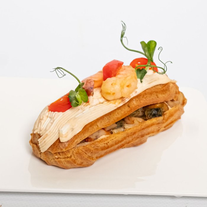 Закуска из филе куриного под луковым маринадом (филе куриное, лук репчатый свежий, масло подсолнечное, соус соевый, кориандр, микрозелень горчицы). Пищевая ценность в 100г продута содержится: Белки-30,29г,Жиры-9,4г,Углеводы-0,7г; Закуска фуршетная Эклер с морепродуктами (сыр творожный, филе сёмги с/с, майонез, креветки с/м, кальмар с/м, мидии с/м, масло подсолнечное, чеснок свежий, коньяк, соевый соус, устричный соус. Профитроли: смесь для заварного теста). Белки-10,33г,Жиры-11,83г,Углеводы-2,9г; Закуска фуршетная Сливочная страчателла/томаты черри/соус бальзамик (крем cливочный Страчателла 60% (молоко коровье цельное пастеризованное, сливки животные, соль пищевая, заквасочная культура, сычужный фермент), томаты черри, соус Бальзамик (уксус бальзамический, сахар-песок), зелень базилика). Белки-10,5г,Жиры-24,5г