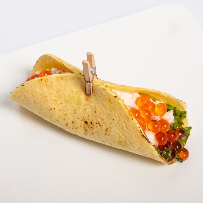 Миниатюрные, хрустящие, мексиканские лепешки с нежной начинкой из крабового мяса, свежего огурца, творожного сыра, украшенные белковой красной икрой. Легкие и хрустящие тако впишутся в любую компанию!