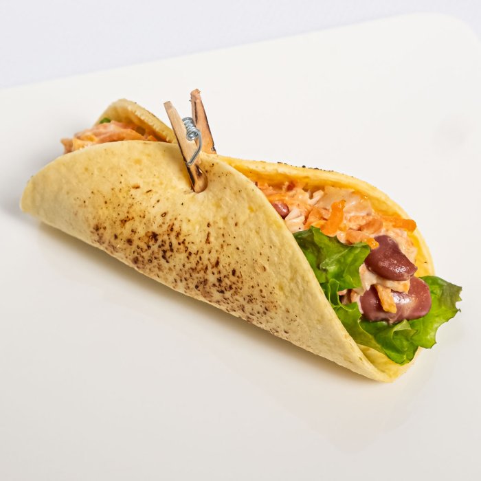 Сырные тако с пикантной и сытной начинкой из нежной мякоти цыпленка, фасоли, моркови и букетом ароматных приправ под майонезной заправкой. Яркая и сочная закуска с идеальным сочетанием отборных ингредиентов!