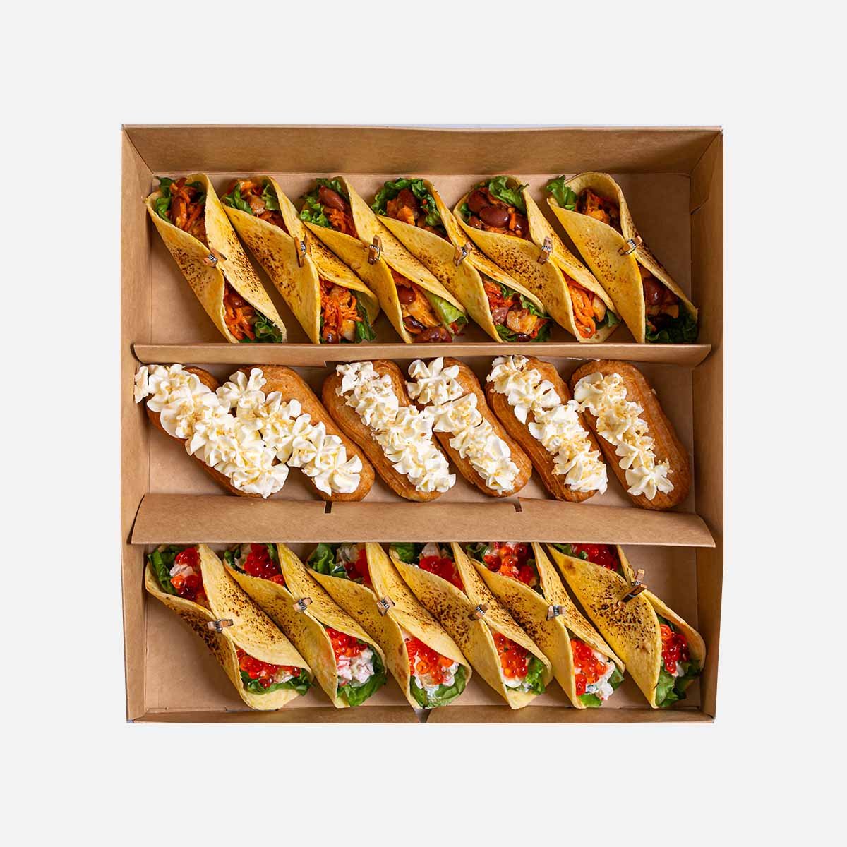 Мини-тако Морское царство (лепешка сырная, крабовое мясо (имитация), огурцы, сыр творожный, лист салата, икра белковая красная). Белки-6,80г, Жиры-11,50г, Углеводы-10,70г; Закуска с печенью трески/яйцом и сыром (заварное тесто (смесь для заварного теста, яйцо куриное, масло подсолнечное, вода питьевая), печень трески, сыр творожный, яйцо куриное, кунжут). Белки-7,20г, Жиры-15,30г, Углеводы-9,20г; Мини-тако с цыпленком и фасолью (лепешка сырная, мякоть цыплёнка, фасоль, морковь, майонез, чеснок, петрушка, соль, перец черный молотый, подсолнечное масло, лист салата). Белки-10,50г, Жиры-25,80г, Углеводы-10,20г