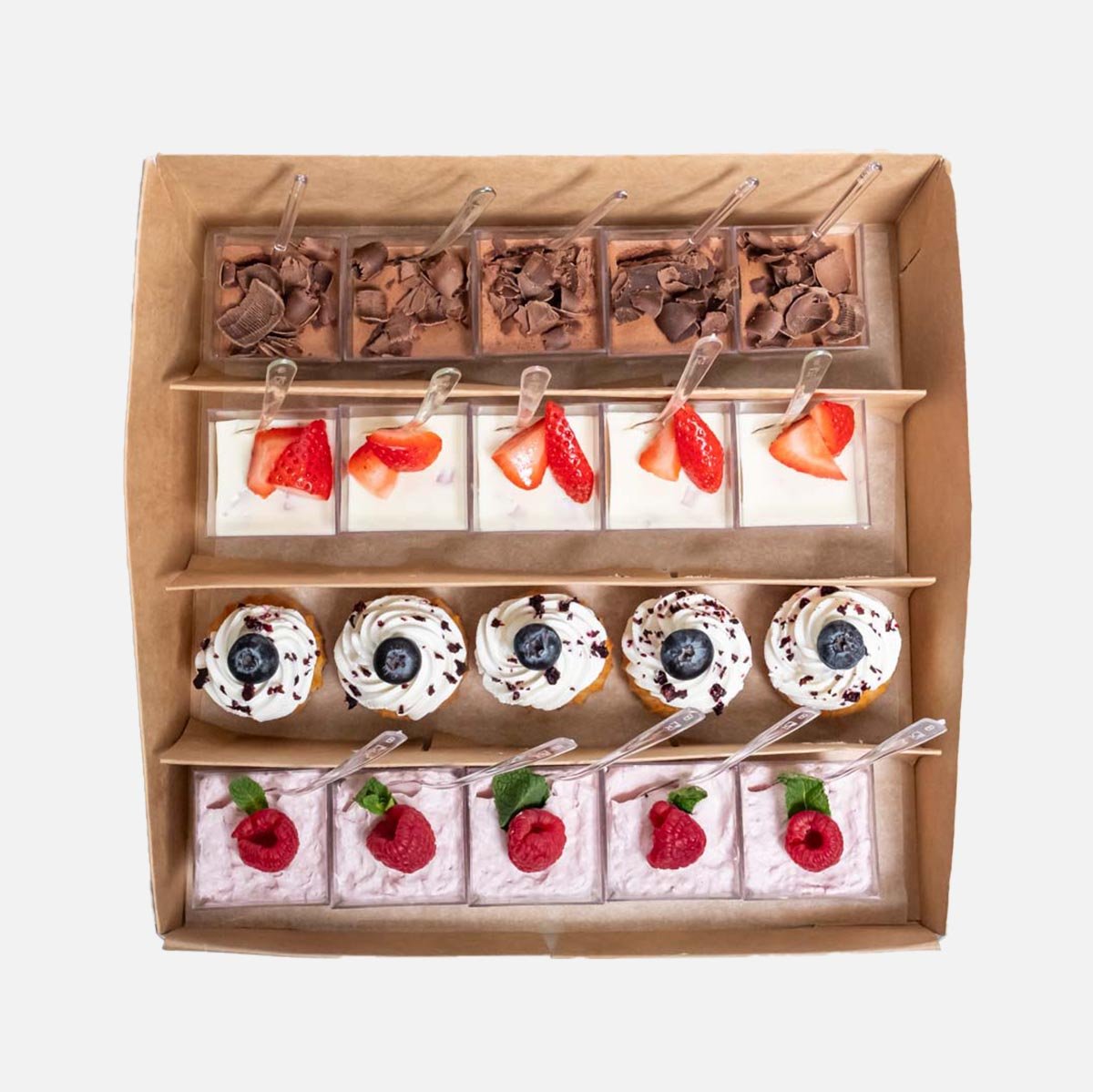 Десерт сливочный(Сливки натуральные, клубника свежая,сахар,молоко,желатин, ванилин,глазурь нейтральная.Содержание в 100гр продукта: белки-2,48;жиры-24,16;углеводы-17,57),Профитроль с голубикой(Яйцо куриное, мука пшеничная в/с, черника с/м, сахарная пудра,сыр творожный, сливки натуральные, сливки растительные,масло сливочное, голубика свежая,загуститель каби,черная смородина сушеная,соль.Содержание в 100г продукта: Белки-3,65,Жиры-12,91,Углеводы-18),Десерт Шоколадное трио(Молоко цельное, сливки натуральные, шоколад белый, шоколад молочный, шоколад темный, шоколадная глазурь темная, крем какао, желатин.. Содержание в 100г продукта: Белки-6,54, Жиры-27,81, Углеводы-34,3),Десерт малиновый(Сыр сливочный, сливки натуральные, малина с/м, сахарная пудра, мука пшеничная в/с, молоко сгущенное, яйцо куриное, малина свежая, мята свежая, сода пищевая, ванилин. Содержание в 100г продукта: Белки-4,81, Жиры-17,12, Углеводы-28,67.)
