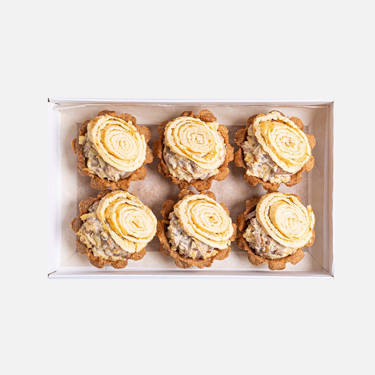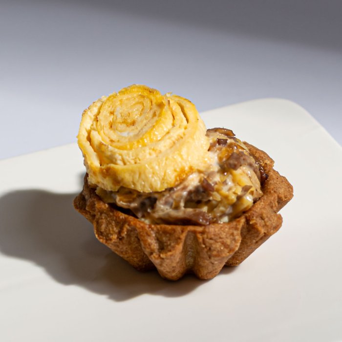 Хрустящие корзиночки наполнены нежным салатом из яичных блинчиков, сочной говядины, репчатого лука и зелени под майонезным соусом. Сливочный вкус идеально оттеняется чуть грубоватой текстурой тарталетки с характерными ржаными, кисловатыми нотками. Гармоничное сочетание продуктов и удобный порционный формат делает эту закуску одним из самых популярных блюд на праздничном столе.