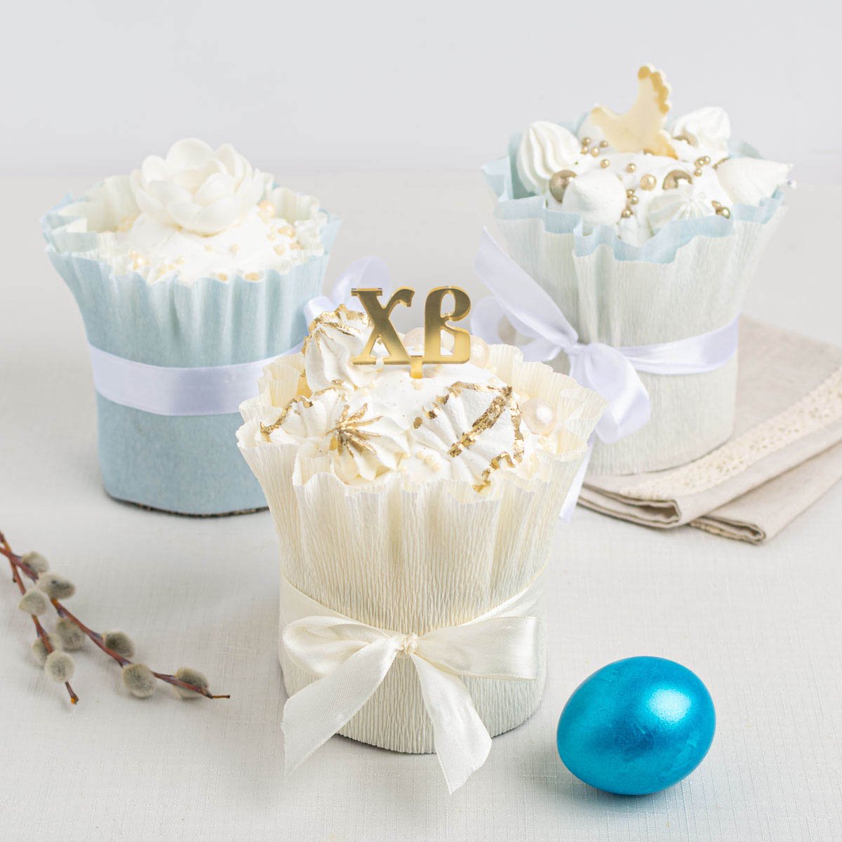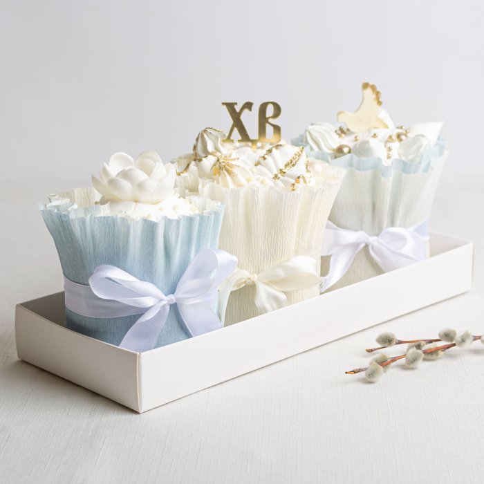 Кулич Цукатная фантазия (мука пшеничная в/с, смесь кондитерская, творог, масло подсолнечное, цукаты, сахар-песок, яйцо куриное, помадка сахарная, глазурь шоколадная белая, посыпка сахарная, кислота лимонная, водка, краситель пищевой). Содержание в 100г продукта: Белки-6,48г, Жиры-22,51г, Углеводы-43,97г; Кулич Медово-пряный (мука пшеничная в/с, сахар-песок, масло подсолнечное, яйцо куриное, смесь пряная, грецкий орех, курага, клюква сушеная, помадка сахарная, посыпка сахарная, глофа, пудра сахарная, кислота лимонная, водка, краситель пищевой). Содержание в 100г продукта: Белки-5,69г, Жиры-7,39г, Углеводы-60,27г; Краффин с творогом и цукатами (мука пшеничная в/с, молоко, сыр творожный, творог, яйцо куриное, сахар, масло сливочное, цукаты, помадка сахарная, посыпка сахарная, дрожжи, загуститель, соль, ванилин). Содержание в 100г продукта: Белки-6,67г, Жиры-6,69г, Углеводы-43,05г