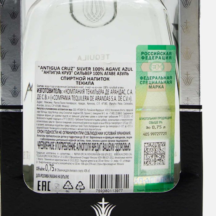 Нап спиртТекилаАнтигуа Круз Сильвер 100% Агаве Азуль 40% ст/б 0,75