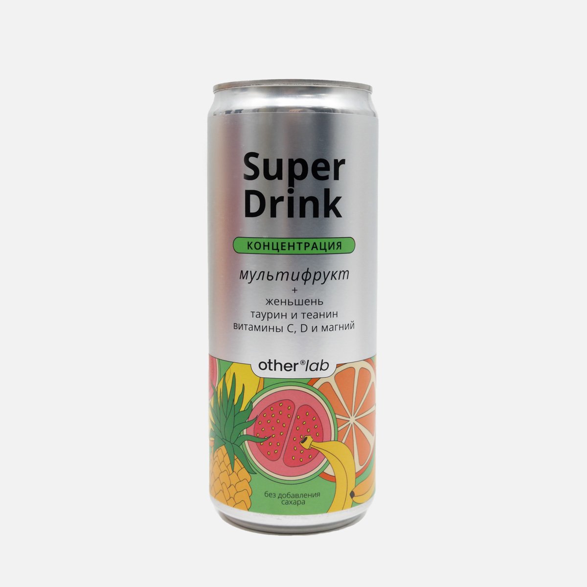 Вода питьевая, концентрированный сок мультифрукта (соки и пюре: манго, банана, ананаса, апельсина, маракуйи, гуавы), сироп топинамбура, витамин С, магний, таурин, теанин, экстракт женьшеня, Витамин Д3, сорбат калия.