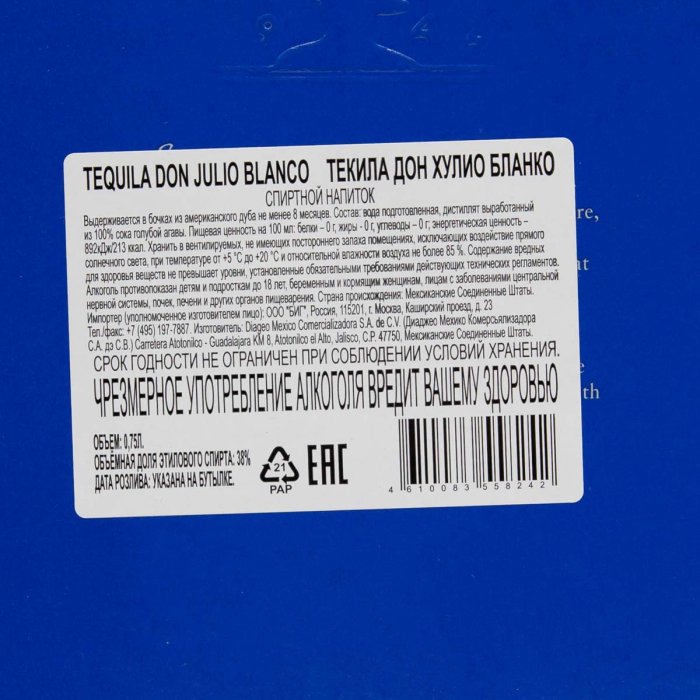 Напиток спиртной Текила Дон Хулио Бланко 38% п/у 0,75л