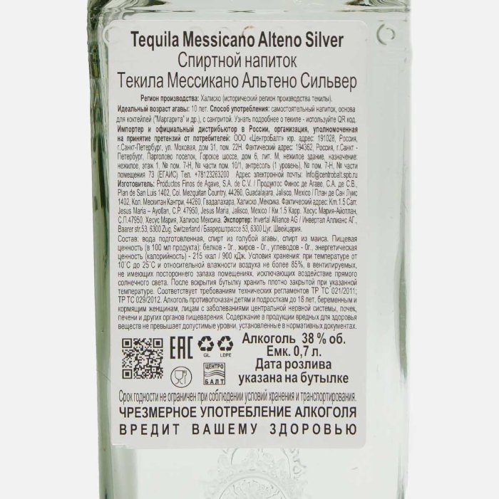 Напиток спиртной Текила Мессикано Альтено Сильвер 38% ст/б 0,7л