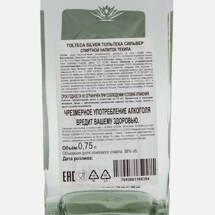 Напиток спиртной Текила Тольтека Сильвер 38% ст/б 0,75л