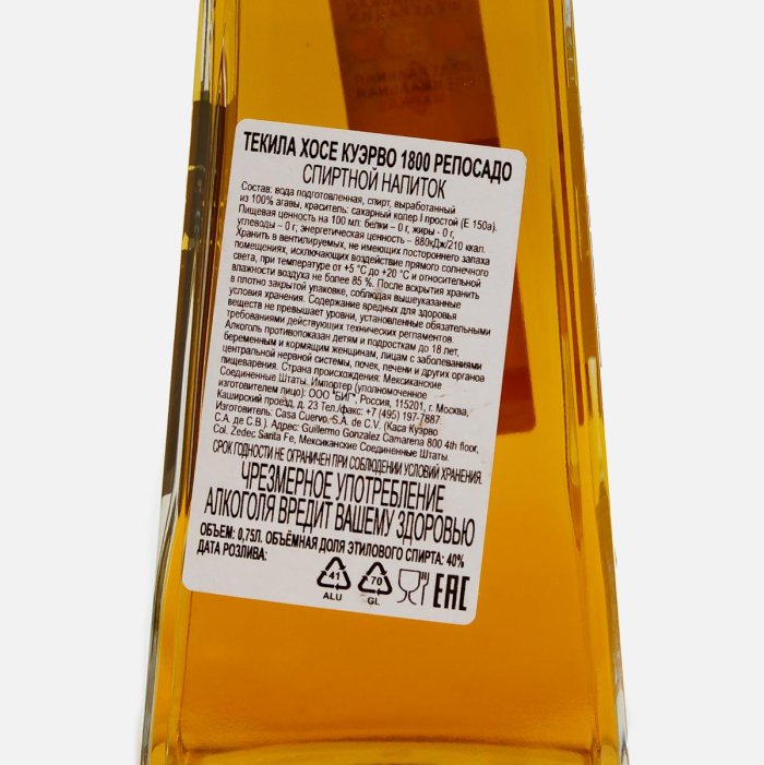 Напиток спиртнойТекилаХосеКуэрво 1800 Репосадо 40% ст/б 0,75л