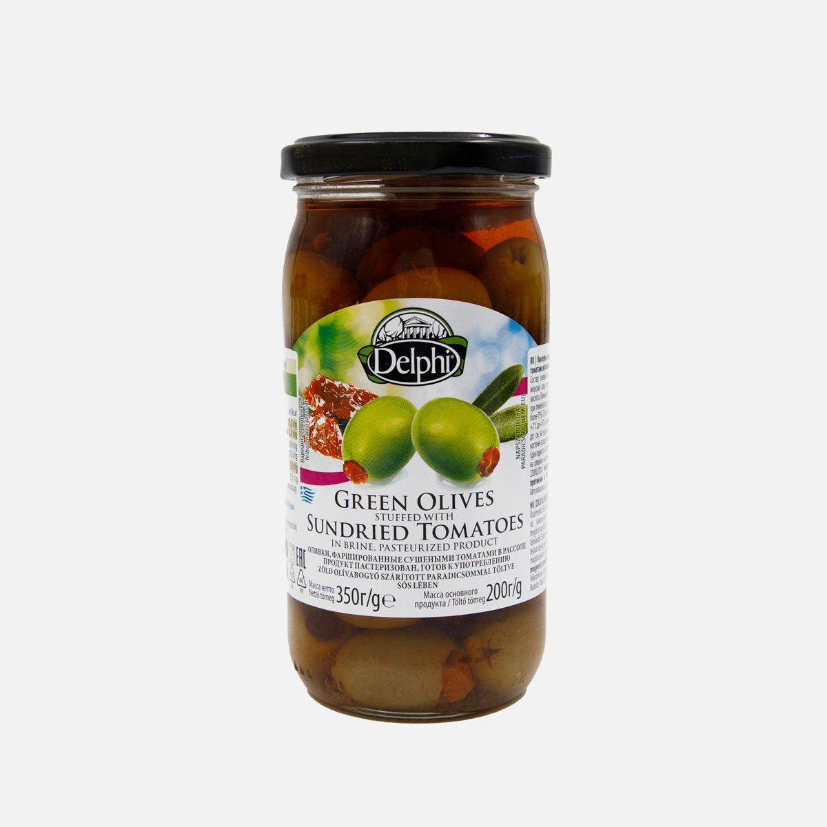 Оливки Делфи фаршированные сушеными томатами в рассоле 350г