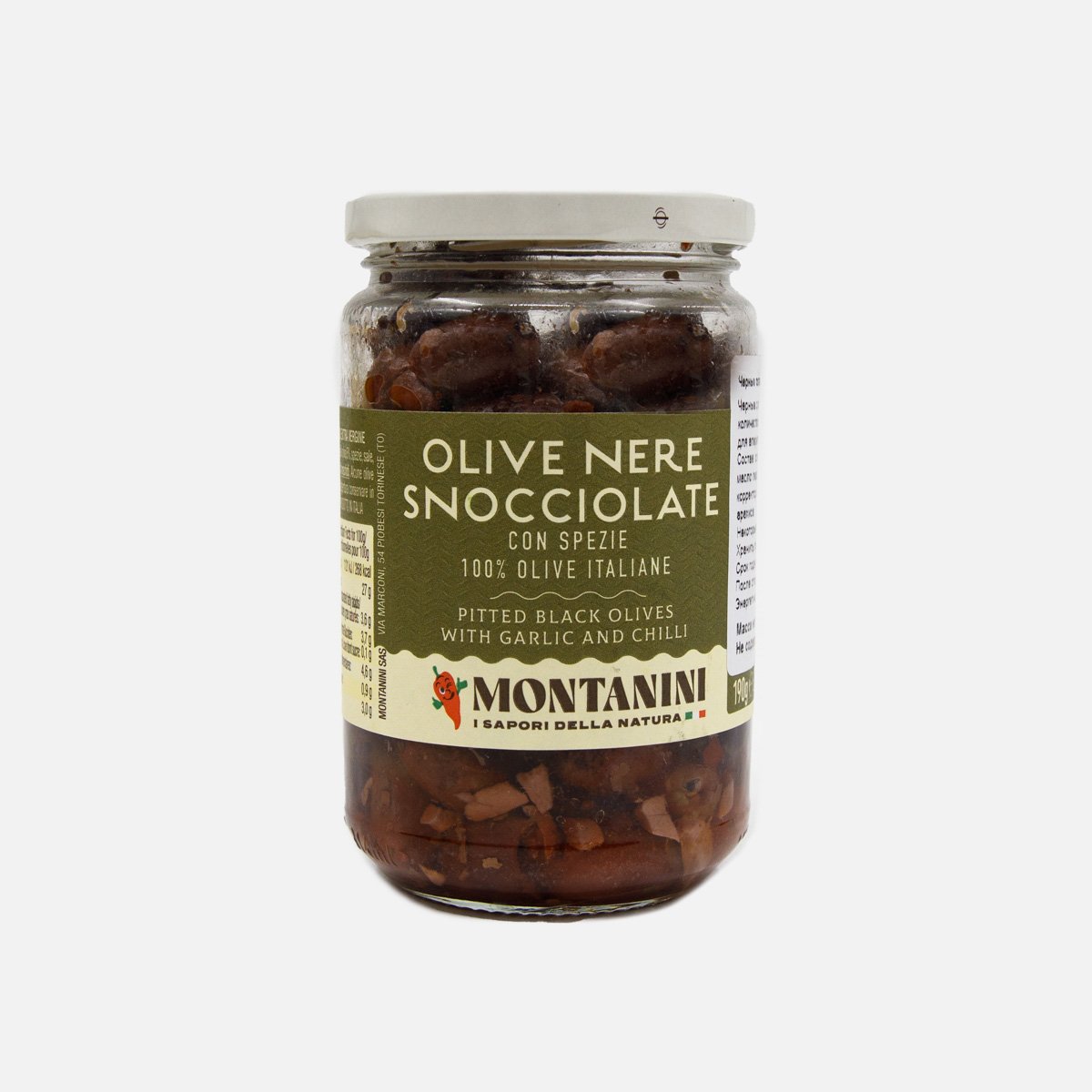 Оливки Монтанини черные без косточ с чесноком/перцем чили 190г